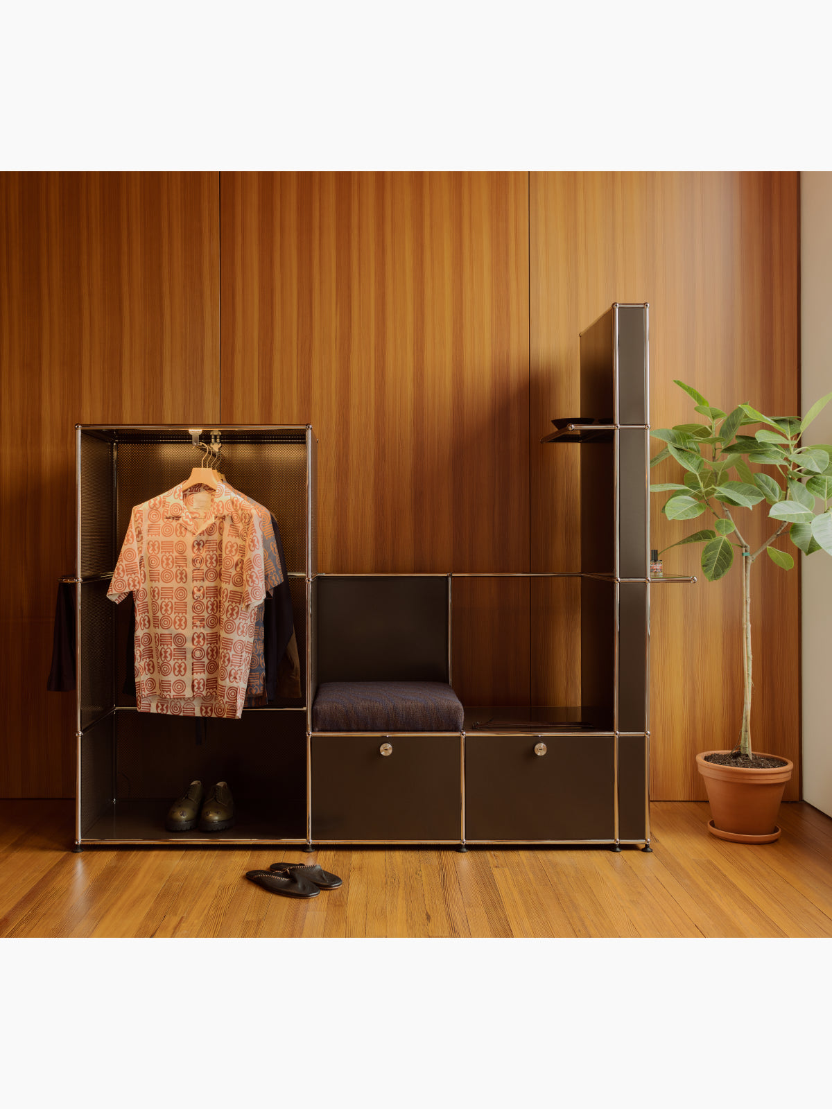 At the heart of the exhibit is an exclusive collection of USM custom designs featuring the NKYINKYIM bookshelf, MANSA asymmetrical platform bed, MANJAK lounge chair, ARKAD side table, and OKINKA valet wardrobe stand.